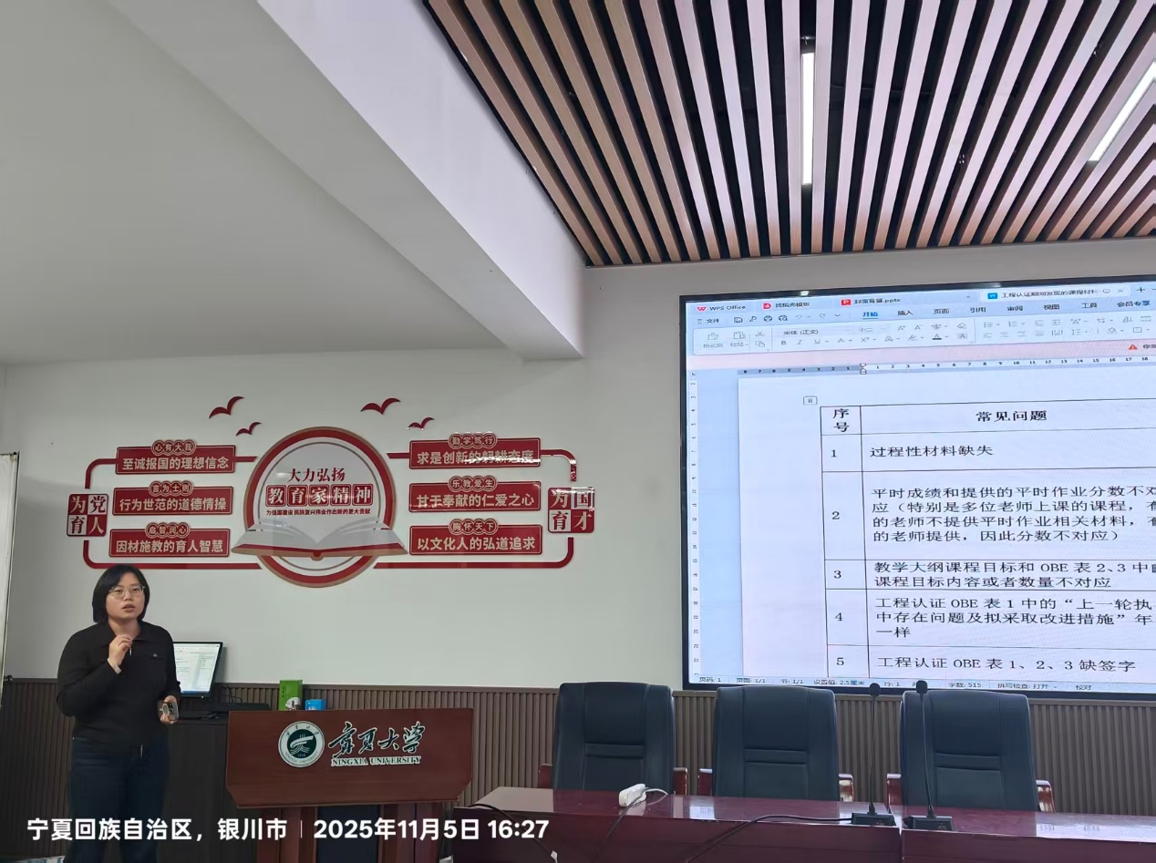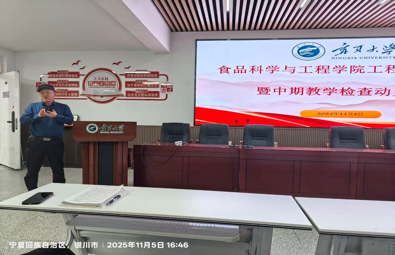 2025年11月5日14时30分,宁夏大学食品科学与工程学院在明远楼512会议室召开“学院工程认证工作总结暨中期教学检查动员会”。本次会议由食品科学与工程系系主任潘琳老师主持。
