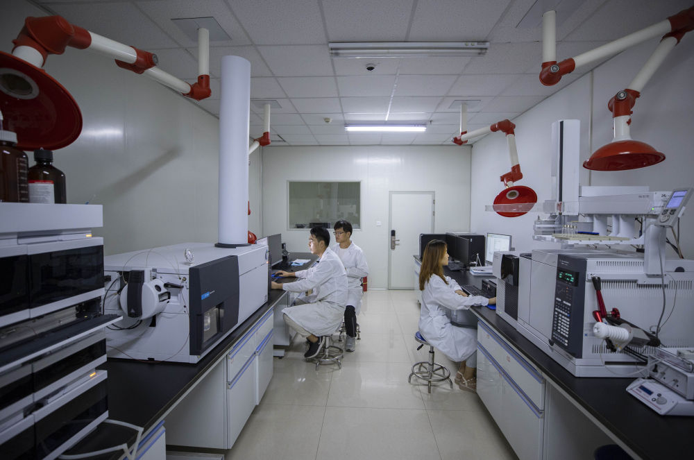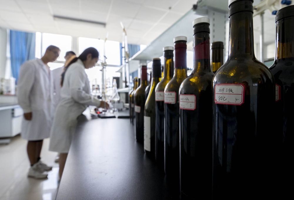 在宁夏大学食品与葡萄酒学院葡萄系的葡萄与葡萄酒质量分析实验室内,研究生在进行葡萄酒化学物质分析(7月8日摄)。