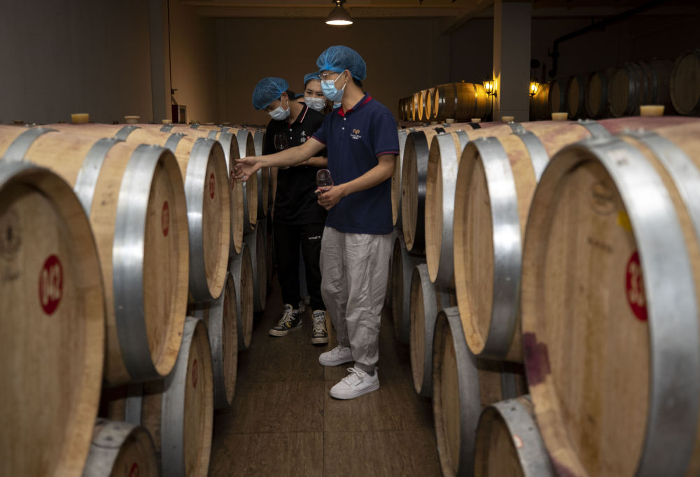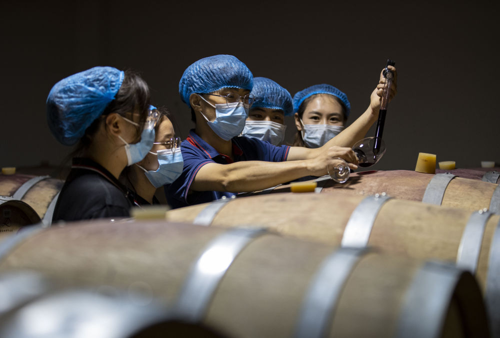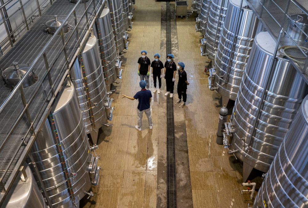 在位于宁夏贺兰山东麓的一酒庄的酿造车间,宁夏大学食品与葡萄酒学院葡萄系的学生在向酒庄工作人员(前)学习车间生产知识(7月8日摄)。