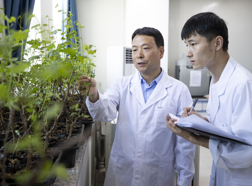 在宁夏大学食品与葡萄酒学院葡萄系的葡萄抗逆分子育种实验室内,教师(左)指导研究生开展低温胁迫后的葡萄表型观察与分析试验(7月8日摄)。