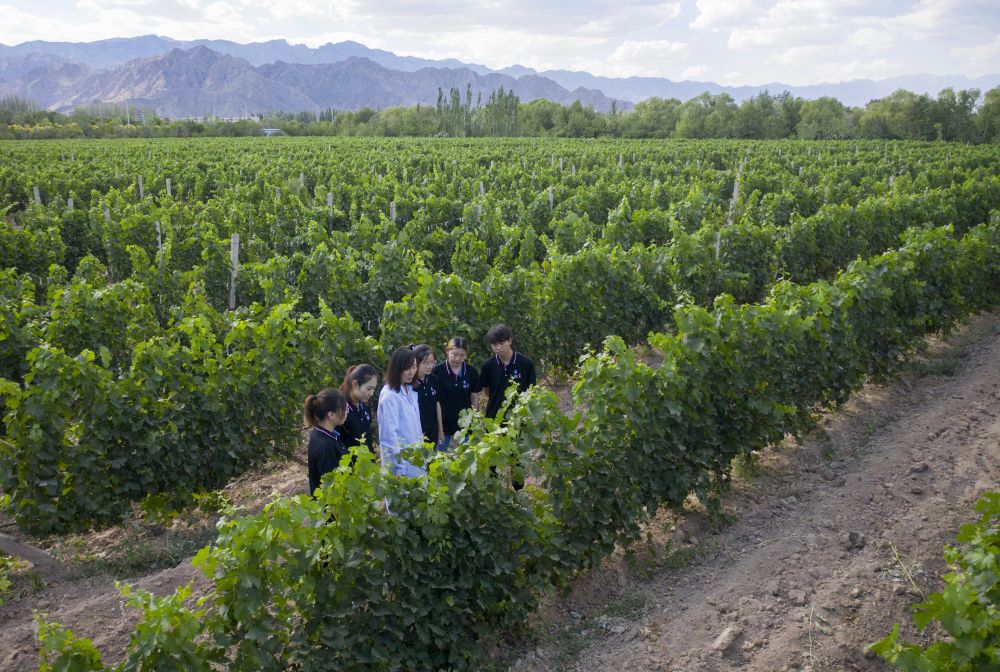 在位于宁夏贺兰山东麓的一酒庄的葡萄园内,宁夏大学食品与葡萄酒学院的教师(左三)为学生讲解葡萄栽培知识(无人机照片,7月8日摄)。