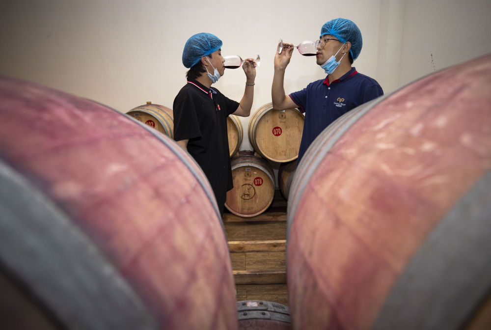 在位于宁夏贺兰山东麓的一酒庄的橡木桶陈酿区,酒庄工作人员(右)和宁夏大学食品与葡萄酒学院葡萄系的学生一同品尝葡萄酒(7月8日摄)。