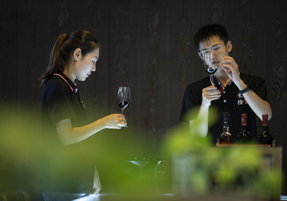 在位于宁夏贺兰山东麓的一酒庄的品酒室,酒庄工作人员(右)向宁夏大学食品与葡萄酒学院葡萄系的学生展示葡萄酒产品(7月8日摄)。